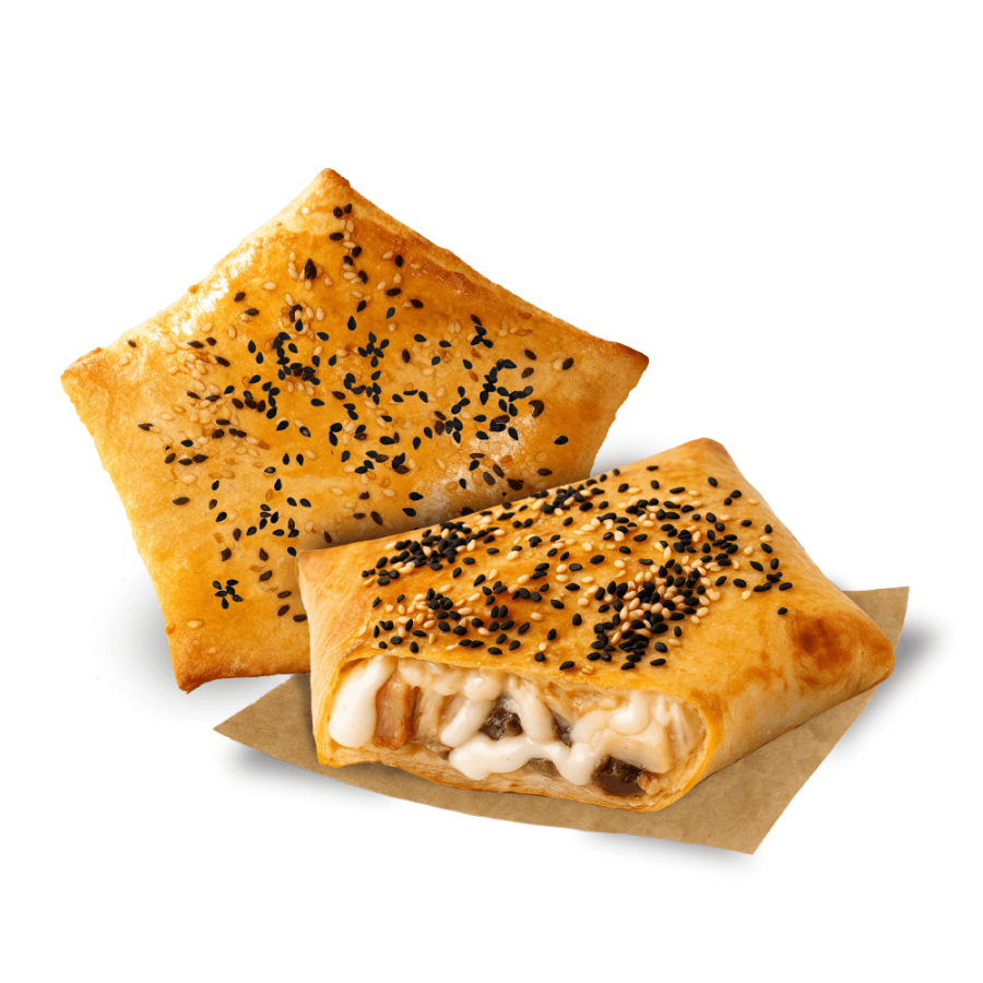 Запеченная лепешка пшеничная Филе куриное фри Шампиньоны Продукт Моцарелла Кунжут Соус альфредо